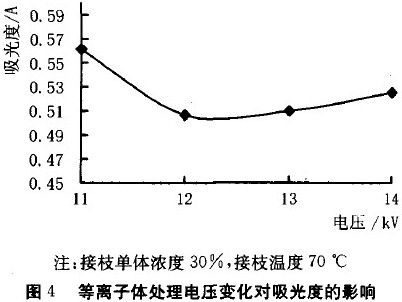 试验中,氮气等离子体处理压强大气压,频率4 KH2,处理时间为40 S。将处理后的亚麻用酸性染料染色,染色残液吸光度随处理电压变化如图4所示。
