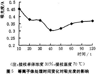 由图5可见,随着等离子体处理时间的增长,自由基被迅速引发并很快达到生成与消失的动态平衡,自由基浓度达到最大,此时上染率最高,即40 S时所对应的吸光度最低。这很可能是因为处理时间增加,表面刻蚀加剧,纤维表面的极性基有所减少。这一点与比表面积随处理时间增加而急剧增加的测定结果相吻合[6]。而后,链终止开始占据一定优势,自由基浓度经历过较短时间的小幅度降低后,基本趋于稳定。