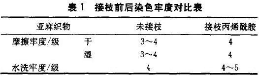 表1所示为亚麻试样接枝前后染色牢度变化的对比表,可以看出接枝丙烯酰胺后酸性染料的染色牢度有了不同程度的提高。