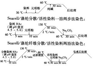 (2)Seacell/涤纶针织物适宜采用分散/活性高温高压一浴两步法染色工艺,染色时两种染料先以高温常规工艺染色,再降温,加碱,使活性染料在Seacell纤维上固着。此工艺节能降耗。