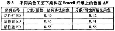 表3为ED型活性染料在不同染色工艺下对Seacell纤维和Seacell/涤纶染色织物的色差,以活性染料常规染色的布样为标样。
