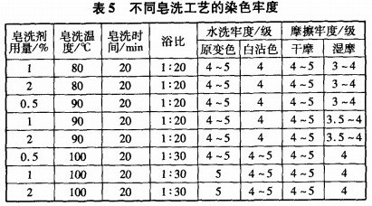表5中,通过增大皂洗剂用量,提高皂洗温度及加大浴比,色牢度可以提高0.5级,但从实际需要考虑,选择皂洗剂用量为1%~2%,温度90℃,时间20min,浴比1:20,即可达到要求。实际生产中,根据织物颜色深浅可以作适当调整。