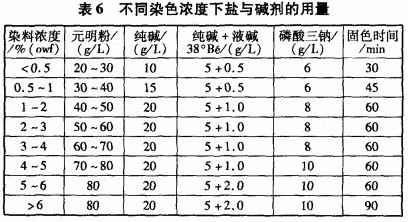 以固色率达到80%以上,色牢度≥3.5级为衡量标准,按照2.2节及2.3节中所确定的染色及皂洗工艺,试验确定不同染料浓度下盐与碱剂的用量,见表6。
