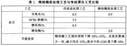 传统前处理工艺用液碱和双氧水漂白.由于液碱碱性强.不容易洗涤.需要多次水洗.工艺时间长.水消耗比较大,而且纤维强力容易受损:而采用精练酶前处理工艺.由于精练酶碱性低.对纤维强力影响小.水洗容易.与传统方法比较.既减少了污染.又节能节水两种工艺的比较见表l。