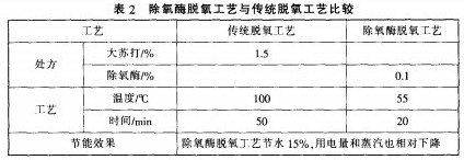 对于氧漂后的脱氧工艺.传统脱氧工艺是应用大苏打或其他化学品脱氧.脱氧效果不理想.且耗水量比较大。为了改善产品质量、降低能源消耗.采用生物酶脱氧工艺.可高效地将双氧水分解为氧气和水它具有专一性.仅作用于双氧水.对染料没有影响.所以脱氧后不用排水可以直接进行染色.既缩短了工艺时间.提高了工效.又减少了污水排放两种工艺的比较见表2。