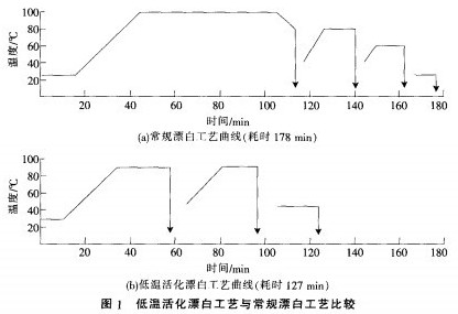 传统漂白前处理工艺采用液碱和双氧水在100℃下漂白由于液碱碱性强.温度高.纺织品不容易洗涤,需要多次水洗,工艺时间长,水电消耗比较大.而且纤维强力容易降低随着技术的不断进步.研究出低温前处理工艺和助剂.使漂白能在80℃的条件下达到高温漂白的要求.可大