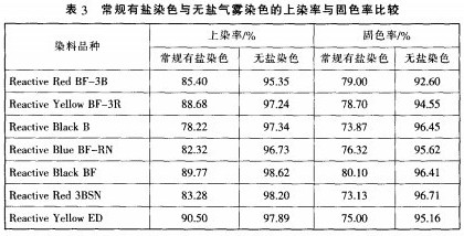 表3通过对7只活性染料的单色试验发现.无盐染色较常规有盐染色的上染率提高9%~15%.固色率提高13%~23%