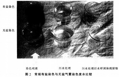 由图2可看出.常规有盐染色要较无盐染色的染色残液色度高.无盐染色的污水易处理.而常规有盐染色污水处理后有大量的固体残留物。