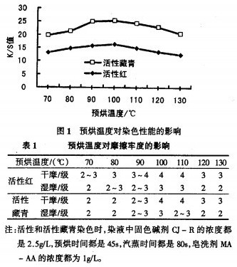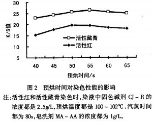 从图l和表l可以看出,随着预烘温度的升高,织物的K/S值和摩擦牢度不断增加,在达到一定预烘温度后,织物的K/S值和摩擦牢度随着预烘温度的升高不断下降。这是因为织物浸轧完染液后,进入预烘阶段,预烘的目的主要有两方面:一是提供纤维的溶胀和染料的渗透时间,确保染料正常扩散上染;二是尽量去除织物上的水分,特别是流动水和毛细管水,使织物湿度低于纤维临界含水率。而在预烘过程中,预烘温度太高,棉纤维的溶胀度相对较大,水和染料的活化能相对较低,毛细管显著,染料的泳移程度增大。同时,温度太高,可能会使部分染料和纤维在预烘时过早固色,不仅会导致固色率不高,而且染料的透染性差,纤维外层的固色量高,色牢度也不好。相反,织物的预烘温度太低时,在相同的预烘时间内,织物的含水量较高,在汽蒸固色阶段,染料较易发生水解,会导致染色织物的K/S值和摩擦牢度降