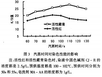 从图3可以看出,随着汽蒸时间的延长,染色织物的K/S值先不断增加,在达到一定程度后,K/S值又呈下降趋势。这是因为浸轧在织物上的染料在预烘时只有少量对纤维发生吸附、扩散和固着,在用饱和蒸汽汽蒸时,染料从蒸汽中吸收水分后扩散进入纤维间的毛细管中,在被纤维吸附的同时向纤维内部扩散,并发生固色反应j。织物的固色是一个过程,需要一定的时间,因此随着汽蒸时间的延长,织物的得色量不断增加,表现为K/S值的增加。然而到达一定汽蒸时间后,织物的得色量又呈下降趋势。这可能是由于染料与纤维键合固着后,在继续汽蒸的过程中,发生了不可逆的断键水解造成的。因此,活性红和活性藏青的汽蒸时间分别选择为90s和ll0s。