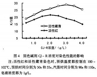 从图4可以看出,随着固色碱剂cJ—R浓度的增加,染色织物的K/S值先增加后降低。这是因为加入碱剂后,一方面促使纤维素纤维羟基离子化,加速了染