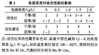 轧染织物经汽蒸固色后,织物上残留部分被水解的染料和少量尚未参加反应的染料,以及染液和固色液中的其他添加物,必须充分洗净,才能获得优良的染色牢度。从表2可以看出,随着皂液浓度的增加,织物的干摩和湿摩都有较大程度的提高,但皂液浓度达到一定程度后,织物的色牢度变化不大。这是因为皂洗过程中,皂洗剂马来酸酐一丙烯酸共聚物钠盐的加入对皂洗液中的杂质具有良好的分散和悬浮作用,可防止杂质沾污设备和织物,可使印染品表面浮色彻底清除;同时它又具有良好的络合能力,能将水中C82M离子螯合,防止生成钙镁染料色淀,降低皂洗效果J。因此,选择MA一从浓度为1~1.5g/L。