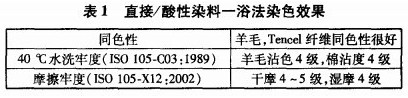 Tencel纤维在中性或碱性条件下染色,而羊毛纤维在酸性条件下染色,选择一浴法染色工艺需兼顾两种纤维的染色特点,故选择直接/酸性染料在中性偏酸性条件下染色。