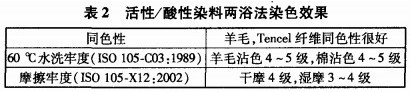 选择的棉用活性染料需对羊毛沾色少,且对第二浴的酸性套染稳定,色变小。由于毛用染料在酸性条件下对Tencel纤维几乎没有沾色,故毛用染料选择面较广,可根据具体客户牢度要求和染色深度选择合适的酸
