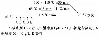 锦棉织物曾一度采用过中性染料与中温型活性染料一浴法染色。即在添加电解质的条件下,先于中性浴85℃染色,再降温至60℃加碱固色,而后水洗、净洗。但该染色法有两大缺点。一是中性染料在85℃染色时,其对锦纶的上染率比在95~98℃时低10%~15%,达不到最高竭染率;二是中温型活性染料在较高温度下吸色,对锦纶的沾色重,锦纶组分的色光较难控制。由于该染色工艺的色泽(色光、深度)重现性较差,且调色较困难,所以基本被淘汰。实践证明,锦棉织物可采用分散染料与热固型活性染料(简称分散/活性)一浴法染色工艺。