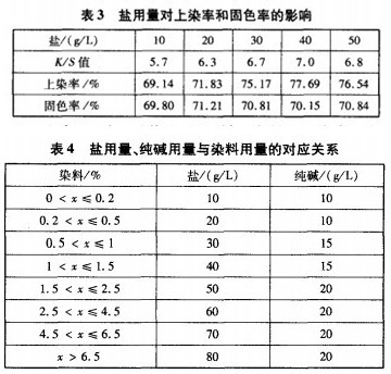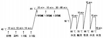 (3)高温型活性染料染双丝光棉针织物工艺为:染色温度8O℃,初染pH值为7,盐用量10~80L,纯碱用量10~20L,染色时间30~60min。