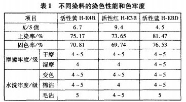 分别选取l%活性黄H.E4R,活性红H—E3B和活性蓝H—ERD对棉针织物进行染色,并测试染色织物的K/S值和色牢度(见表1)。
