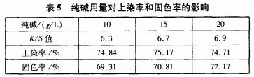 由表5可知,随着纯碱用量增加,织物的固色率不断提高。但织物的颜色变得灰暗,表面颜色不够均匀,有轻微色花现象。多次试验后,确定染料用量和纯碱用量的基本对应关系,见表4。