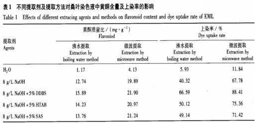 根据直接观察提取液的色深以及调查上染率的结果,均表明以碱溶液作为提取剂的染色效果最好,而以水、酸作提取剂的染色效果很差。采用100—200g/LNaOH均可有效提取和保存染色液,其中又以200g/LNaOH提取的桑叶染色液