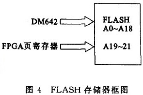 本系统中采用从片外FLASH引导的方式加载程序,片上引导机制总是从第0页开始引导,系统的 BootLoader程序都固化在这一页.所有8个页面均映射到DM642的相同的地址空间0x90000000~ Ox9OOfffff.对FLASH寻址操作时,由DM642将EMIF提供的FLASH相对地址0x00000~Oxfffff,与 FPGA提供的页地址相加,得到数据的实际存储地址,从而实现对8M存储空间的访问.