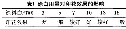 涂料的用量(主要指涂料白)是影响视觉效果的主要因素。用量少,遮盖力差,用量过多,不仅手感差,而且分散印花皂洗时容易脱落, 失去应有的风格。通过对比实验(见表1),涂料白取10%为宜。