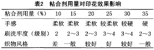 考虑印花后要经过皂洗工序,粘合剂用量应适当提高。为此我们做了粘合剂用量的对比实验(见表2),认为粘合剂用量以25%~30%为宜。