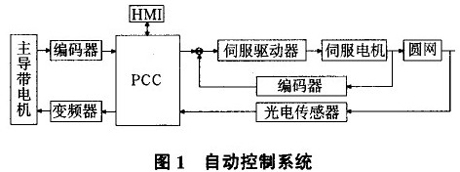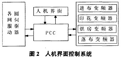 自动控制系统如图1所示,本机采用先进的可编程控制器(PCC)及高精度独立伺服定位系统控制全部机械。避免了集体传动而产生的累计误码率差,同时机械传动长期使用造成机械磨损而易出现跑花现象的缺陷。这种圆网独立传动数字化控制方法,使纵向不跑花,对花精度高,运行稳定性好,一等品率高,如因圆网制造不准确使电脑无法一次性对花到位,圆网印花机还可通过每套色独立控制的显示屏上进行调节,调整期间决不影响主控显示器。