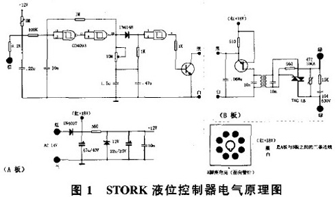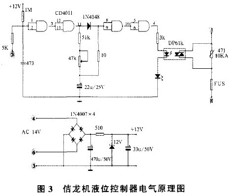 电源采用全波整流方式,经12 V稳压管稳压后提供工作电压。8脚管座3脚单独作为地线。控制部分使用CMOS集成电路CD401i组成检测,延时功能。CD401 1是2输入端4与非门。管脚排列与CD4093相同。电路中将与非门2输入端并联作非门使用。检测和延时部分与STORK相似。不同的有以下几点: