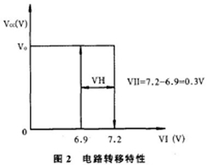 控制部分使用CMOS集成电路CD4093组成检测,延时功能。CD4093是2输入端4与非施密特触发器。(图1中只画出3只门电路,不使用的门电路输入端要接固定电平,实际电路中1、2接4脚,3脚悬空。这一部分在图1中没有表示出来。)在本电路中将与非门2输入端并联作非门使用,色浆液位探头由8脚管座5接人,经过阻容滤波,去除外界干扰,加至输入端12、13脚,经过2次反相,第10脚输出。由图l所示,10~l2、13脚之间接有1M 电阻,使这2只非门组成具有回差的施密特触发器。实测探头电位在>7.2 V 或<6.9 V 时门输出跳变,与第10脚输出关系,形成回差电压,约0.3 V。电路转移特性如图2。当输入信号电压在6.9~7.2 v 之间变化时,输出保持原状态不变化,提高了输入信号的抗干扰能力。
