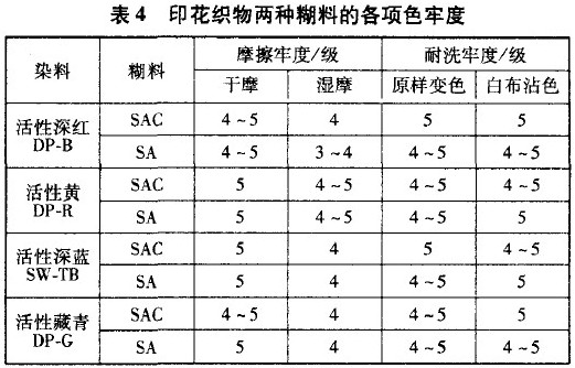 两种糊料不同颜色印花织物的耐洗及耐摩擦牢度如表4。