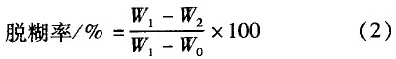 (2)脱糊率测试将织物烘至恒重,置于干燥器中冷却,分别称得印花前织物重w0,印花后未皂洗织物重w1,皂洗后织物重w2。按式(2)计算脱糊率: