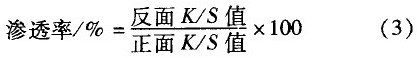 (3)K/S值、渗透率和色泽不匀度用电子测色配色仪测定印花织物花纹处的K/S值;由正反面的K/S 值按式(3)计算渗透率:
