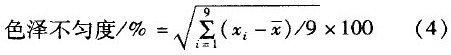 选择九处印花花纹测定K/S值,并计算平均值,按式(4)计算色泽不匀度,该值越小,则印花均匀性越好。