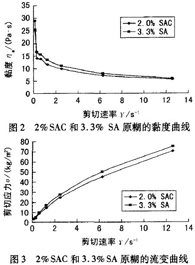 由图1可知,增大含固量,两种原糊的黏度均增大,但SAC糊黏度的增加幅度明显高于海藻酸钠糊。这说明,若达到同样的原糊黏度,SAC的用量要比SA 小很多。这是因为SAC糊料分子间存在较大的静电斥力,可形成三维网络结构,能网住更多的水分,表现出较高的成糊率。