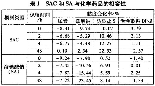 由表1可知,SAC原糊对各类化学药品的稳定性,总体好于海藻酸钠原糊,而且放置时间越长,优势越明显。由此可见,SAC对活性染料印花用的化学药品有很好的适应性,容易制得稳定的印花色浆。