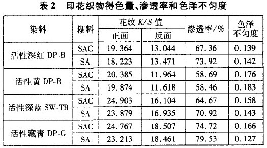 分别用活性深红DP—B、活性黄DP—R、活性深蓝 SW—TB和活性藏青DP—G在平纹棉织物上印花,测试印花织物正反面的K/S值、色泽不匀度及渗透率情况,见表2。