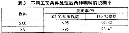 表3中,102℃常压汽蒸是活性染料印花最常用的固色条件,在此条件下,SAC糊和sA糊均可达到较理想的脱糊率(大于95%)。经130℃ 焙烘处理后, SAC脱糊率仍达94.32%,略高于sA糊。