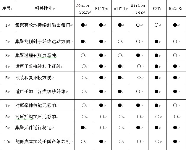 在第一大类型中的第一种集聚罗拉型紧密纺系统中,瑞士立达公司一骑绝尘,国内无人随后,无从对比。在第二大类型的机械集聚型紧密纺系统中,瑞士的罗氏公司领先,国内已有几家类似设计,但尚无应用报道。