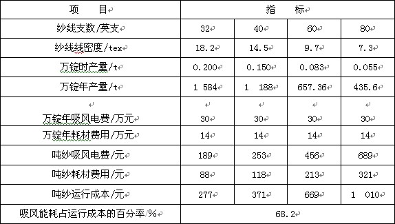 ①假设吸风电动机的能耗每万锭约为70kW/h,以电价0.55元/ kW•h、年工作330d、每天工作24h计,则吸风电动机每年的万锭能耗费用约为30万元,计算过程如下: