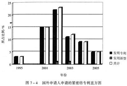 ②从申请时间角度看,紧密纺技术的国外专利申请在国内始于 1995年,所申请的3件专利均已于2000年年初获权;国内专利申请的起步时间是2000年,至少迟于国外5年;国内紧密纺发明专利申请的高峰是在2004年,而国外紧密纺发明专利申请的高峰是在2002年,有明显的向后错峰(图7—3、图7—4)。在技术更新周期越来越短的情况下,这应当说是个不小的差距。
