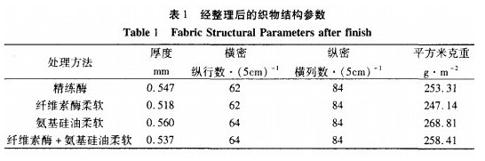 (2)纤维素酶整理后织物的厚度变小,平方米克重减小,密度不变;氨基硅油整理后织物的厚度变大,平方米克重增加,密度变化不大;纤维素酶配合氨基硅油整理后织物的厚度变小,平方米克重增加,密度变化不大。