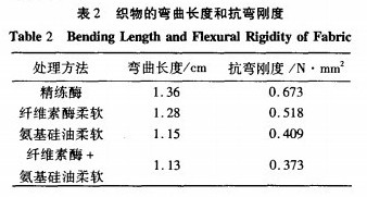 氨基硅油整理后织物的弯曲长度和抗弯刚度较纤维素酶的小,即氨基硅油整理后的织物的柔软性较纤维素酶整理后的好,织物较滑爽。这与氨基硅油柔曲性非常好的大分子主链及易挠曲的螺旋链结构大分子空间构型有很大的