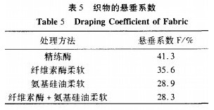从表5中数据可以看出,纤维素酶整理后,织物的悬垂系数减小很多,织物悬垂性增强;氨基硅油整理后,织物的悬垂性比纤维素酶整理后的好;采用纤维素酶配合氨基硅油整理后织物的悬垂性与单独采用氨基硅油的相当。究其原因是因为纤维素酶整理后,消除了织物弯曲滞后现象,织物柔软性增加,同时悬垂性增加。而氨基硅油具有柔曲性非常好的大分子主链及易挠曲的螺旋