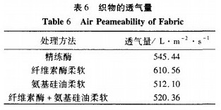 氨基硅油整理后织物的透气量下降,透气性变差。这是因为经氨基硅油柔软整理后,氨基硅油吸附在纤维表面织物表面,形成了一层薄的平滑膜,织物的透气性变差。冈此采用氨基硅油整理和纤维素酶配合氨基硅油整理后织物的透气性变差。