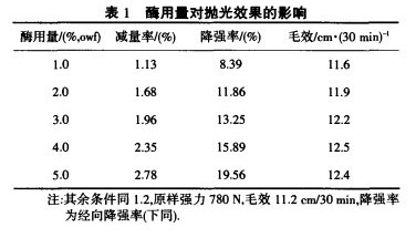 由表1看出,随着酶用量的增加,减量率和经向降强率呈线性增大,毛效也提高明显.而生物抛光整理织物的减量率不宜大