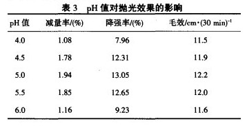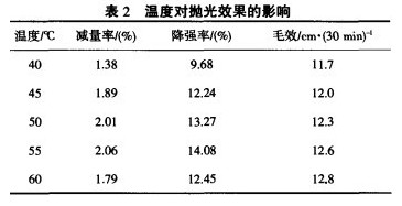 纤维素酶催化反应速度随着温度的升高而增大,但酶会高温失活,影响生物抛光效果.只有在最适温度下,酶催化反应才表现出最大的反应速度.温度对酶催化作用的影响表现为对酶失活和反应速度的影响.从表2知,40~55℃下,减量率和降强率随温度的升高而增大,60℃时出现下降,这时纤维素酶已经开始部分失活.而毛效随处理温度的升高有不同程度的改善.根据实验结果,纤维素酶的整理温度为45~55℃.