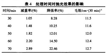 由表4可知,随着时间的延长,苎麻织物的减量率和经向降强率也随着增加.原因是在催化反应时,酶首先作用于纤维的表面和无定形区,然后作用于结晶区的边缘,使结晶区不断减小.当处理时间超过50min后,织物的降强率超过15%,损伤过于严重;反应时间过短,酶作用不充分,表面绒毛去除不净,抛光效果不佳.因此,纤维素酶处理的时间控制在40~60min.