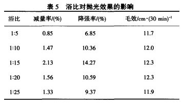 由表5可知,处理浴比为1:15时,织物的毛效最好,减量率和强降率也最大,不影响服用性能.当浴比<1:15时,织物和酶液接触不充分,造成织物减量不均匀.当浴比>1:20时,酶用量减少