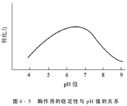 极端的酸度和碱度能使酶失效,而且这种失效都是无法逆转的。这与在接近最适合pH值范围内的变化所引起的可逆性失效是不同的。另外必须注意浆料中的碱质也能导致酶的作用减弱。酶作用的稳定性与pH值的关系如图4-5所示。