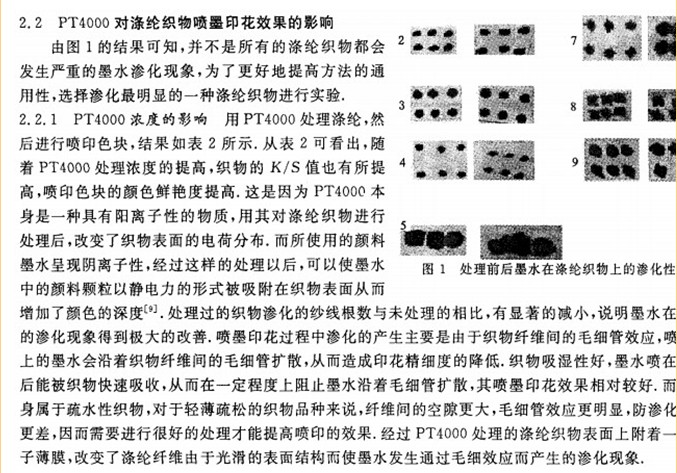 颜料墨水的纺织品喷墨印花在国内是一项正在发展中的技术,国际上也只有汽巴、巴斯夫等几个少数大的化学公司掌握,而且做为技术机密其具体的资料未有公开的报道.目前可以在一些专利中找到对棉织物进行预处理以提高颜料墨水喷墨印花效果的报道,如USP.11521693[5],USP.10529078[6等,但未见有对涤纶处理方法的报道.中国专利CN1707017A公开了一种数字喷墨印花用织物的预处理工艺,是采用增稠剂、阳离子助剂的混合水溶液处理,适合多种纤维织物的喷墨印花.吴桂军阐述了用自制的阳离子季胺盐对涤纶进行预处理可以提高喷墨印花的效果.PT4000是一种染色用的阳离子季铵盐型固色剂.本文选择PT4000对涤纶进行处理,实验结果显示,通过PT4000能较好地改善涤纶颜料墨水喷墨印花质量.